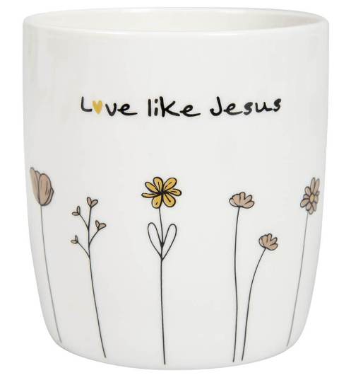 Trendy motief: Mooie beker met gestileerde bloemen en opschrift “Love like Jesus” in zwart en goud. Een hoogwaardig cadeau voor het vormsel/communie of verjaardag!